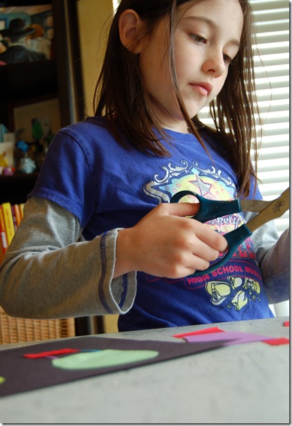 You can probably figure out how this craft project is created. All you have to do is cut out a bunch of paper scraps [if you don’t have them already], set them in front of your kids along with some glue sticks, give them a piece of construction paper, and tell them to have at it. That’s it. Easy as pie. Here’s the picture montage…